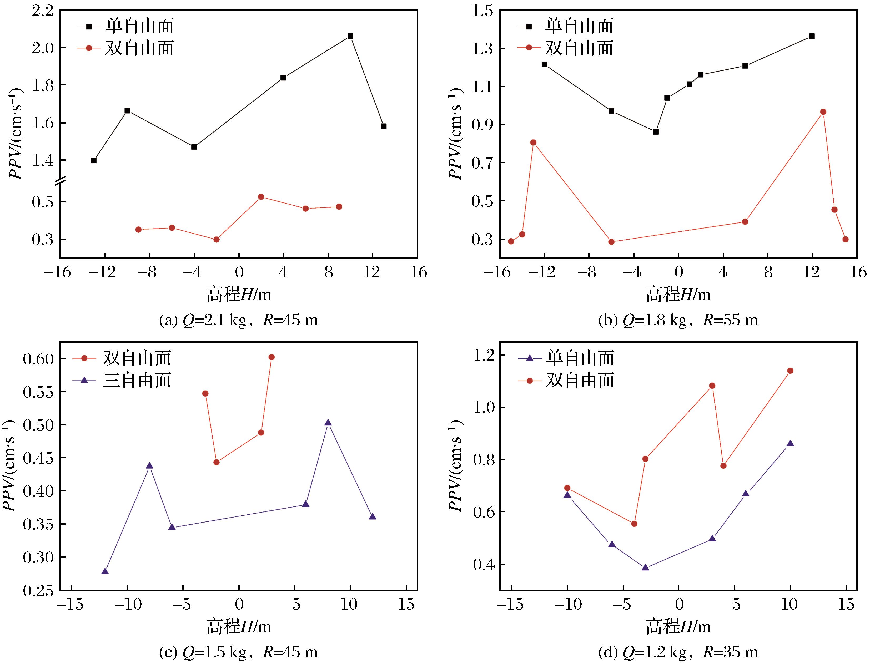 | 图5 不同单段药量和爆源距条件下PPV分布折线图 |