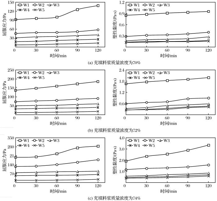 在水化时间相同的情况下,随着尾砂中-38 μm细粒级含量的增加,充填料浆屈服应力和塑性黏度增大,且细粒级含量越大则屈服应力和塑性黏度增加幅度越大。如质量浓度为74%的充填料浆,细粒级尾砂含量由30.32%分别增加至44.37%、52.83%、59.44%和69.65%,充填料浆的初始屈服应力(0 min时)分别增加了37.09,59.45,107.70,179.85 Pa;初始塑性黏度分别增加了0.048,0.181,0.772,1.533 Pa·s。同样,细粒级尾砂含量越大,随时间的增加充填料浆屈服应力和塑性黏度增加幅度越大。例如:对于由细粒级含量为69.65%的尾砂(W1)所形成的充填料浆,当料浆质量浓度为74%时,水化时间从0 min增加到60 min和120 min,其屈服应力分别比W3(细粒级含量52.83%)所形成的料浆增加了21.90 Pa和75.64 Pa;塑性黏度分别增加了0.492 Pa·s和1.151 Pa·s。