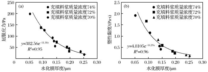 水化膜厚度与充填料浆初始屈服应力(a)和塑性黏度(b)的关系