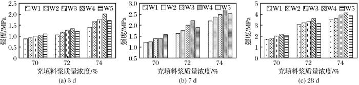 (3)抗压强度测试。将完成流变特性测试的充填料浆倒入三联试模中制成充填试块,脱模后将充填试块放入恒温恒湿养护箱中进行养护(养护温度为20 ℃、相对湿度在95%以上),养护至3 d、7 d和28 d时分别进行强度测试,每组龄期测试3个试块,取平均值作为强度测试结果。
