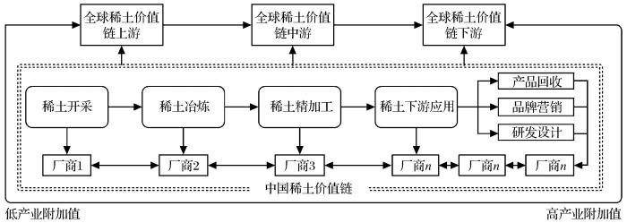 稀土素有“工业维生素”美誉,被广泛应用在农业轻纺、冶金机械和石油化工等传统产业领域,更是大国竞相发展新能源、新材料、智能制造和国防军工等战略性新兴产业领域的关键性原材料(Apergis et al.,2017)。目前,全球稀土资源储量主要分布在中国、越南、巴西和俄罗斯等国家,而我国凭借丰富的稀土资源储量和先进的冶炼分离技术等优势,形成了从稀土采选、冶炼分离、深度加工到终端应用的稀土全产业链,已成为全球稀土储量和产量第一大国,并在全球稀土产业链上、中游环节占据主导地位(Grandell et al.,2016)。但是,我国稀土产业在下游高附加值环节仍存在短板,难以攀升全球稀土产业价值链高端,只能以稀土开采和冶炼分离等单一环节嵌入全球价值链低端。当今世界正遇百年未有之大变局,大国竞争博弈更加白热化。稀土作为战略性新兴产业和未来产业发展的关键性战略资源,被赋予的地缘政治蕴意更加凸显,未来面临的外部发展环境更加复杂多变。以美国为首的西方发达国家正试图以“控制产业链两端、生产加工替代多元化”战略,加强稀土产业全球布局,即通过“上游资源”与“下游应用”两端企业签订长协订单或开展股权投资合作等方式,形成“端对端”的灵活协调机制,加强对上游稀土资源的整合以及对下游高端应用技术的封锁。同时,为降低稀土中间精炼环节对我国单一供给形成的高度依赖,增强本国稀土产业链韧性和抗风险能力,西方国家正在大力寻求稀土冶炼替代加工生产,并以加剧替代国之间竞争来削弱生产国定价权,进而掌控全球稀土市场主导权。如今,全球稀土产业供应格局巨变,我国迫切需要延伸稀土产业链,重构稀土产业价值链,破解低端价值“俘获”困局。破解传统“国际外循环”主导下的各种困境,建立稳健的稀土产业“国内大循环”是实现稀土产业价值链高端跃升的有效关键路径。我国作为全球唯一拥有完整稀土产业链的国家,具备构筑稀土产业“内循环”的雄厚资本,丰富的稀土资源储备和先进的冶炼技术为稀土产业链延伸提供了坚实基础。同时,在“双碳”目标驱使下,应用于新能源汽车、风力发电、节能电梯和变频空调等领域的高附加值稀土功能性材料的市场需求也呈爆发性增长。为此,依托我国丰富的稀土资源和国内规模宏大的市场环境,加速稀土产业“内循环”构建,延伸国内稀土产业链和增强产业链韧性,凭借“以链入链”方式实现稀土产业价值链向高端攀升,对我国稀土突破西方技术封锁和建设稀土制造强国具有重要的战略意义。