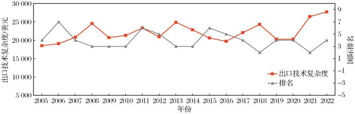 在剖析“外循环”主导下的稀土产业价值链发展逻辑的基础上,进一步对2005—2022年我国稀土产业全球价值链地位进行量化分析。测度方法参照葛建平等(2022)的研究:首先计算稀土上、中、下游产品的出口技术复杂度(Hausmann et al.,2007);然后计算各国稀土产业的出口技术复杂度;最后综合测算得到我国稀土产业的全球价值链地位。