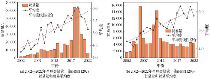 2002—2022年全球金属镓、锗贸易量和贸易平均度