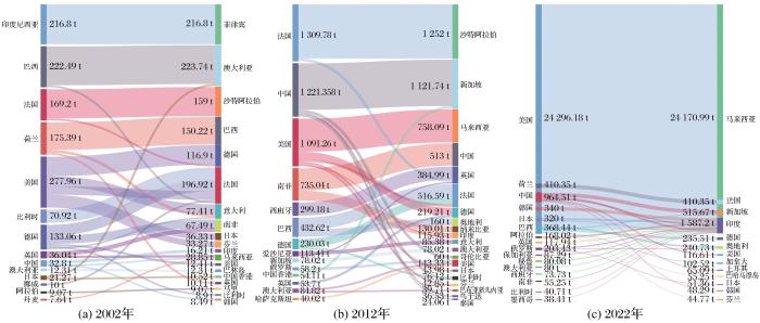 全球金属镓和金属锗贸易国家发生较大变化,本研究选取了两国贸易量排名前30位的数据,描绘了2002年、2012年和2022年这3个时间节点的金属镓、锗全球贸易流向变化。