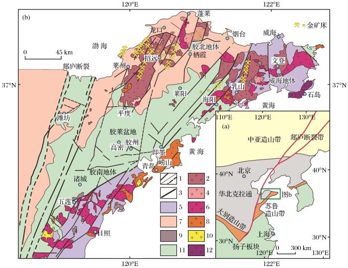 ... (a)中国东部地质简图;(b)胶东半岛地质简图及金矿床分布;1.断裂;2.玲珑岩套;3.区域断裂;4.郭家岭岩套;5.苏鲁造山带;6.伟德山岩套;7.前寒武纪岩石;8.崂山岩套;9.中生代花岗岩;10.白垩纪正长岩;11.中生代盆地;12.三叠纪花岗岩Geological background and gold deposit distribution map of Jiaodong Peninsula(modified after Song et al.,2020)Fig.1