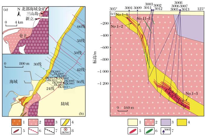 三山岛断裂带金矿体深部连接在一起,且各个矿床地质特征基本一致。北部海域金矿床位于三山岛断裂的东北部[图2(a)]延伸到海域的一段,是我国首个在海域内发现的世界级金矿床,目前已探明储量达470 t(平均品位为4.3×10-6)(Song et al.,2021)。矿区整体上被深度为8.5~20.0 m的海水覆盖[图2(a)、2(b)](宋明春等,2015)。钻探工程显示矿区地层主要为新太古代变质岩和第四系沉积物(35~40 m)[图2(c)]。岩浆岩主要为侏罗纪玲珑花岗岩、白垩纪郭家岭和伟德山花岗岩,脉岩主要为闪长玢岩和煌斑岩。NE向三山岛断裂控矿作用显著,矿体严格沿断裂展布[图2(c)]。