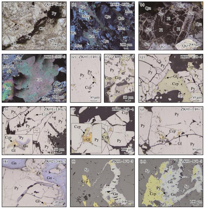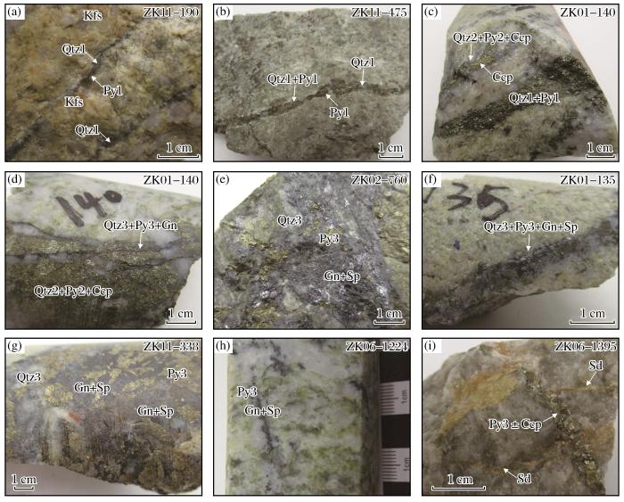 ... 矿化蚀变带沿三山岛断裂分布,蚀变带宽度一般为50~200 m,围岩蚀变主要包括钾长石化、绿泥石化、绢云母化、硅化和碳酸盐化(图3和图4).断裂主断面上、下盘均有矿化蚀变现象,但上盘蚀变较弱且分带不明显,一般无工业金矿体.矿化蚀变带主要由(黄铁)绢英岩组成,以主裂面为界,其下盘依次出现黄铁绢英岩化、绢英岩化和钾长石化带,各带呈渐变关系;主裂面以上主要为绢英岩化,黄铁矿化较弱.根据矿物组合、矿石组构和脉体穿切关系共识别出4个成矿阶段:石英—黄铁矿—钾长石阶段(Ⅰ)、石英—黄铁矿—黄铜矿—自然金阶段(Ⅱ)、石英—黄铁矿—方铅矿—闪锌矿—自然金阶段(Ⅲ)和菱铁矿—方解石阶段(Ⅳ)(图3和图4),与三山岛金矿床一致(Li et al.,2023b).由于该矿床中蚀变矿物分布不均,并未识别出前人提及的热液蚀变期,主要为热液成矿期(Li et al.,2015).上述各阶段详细特征如下: ...