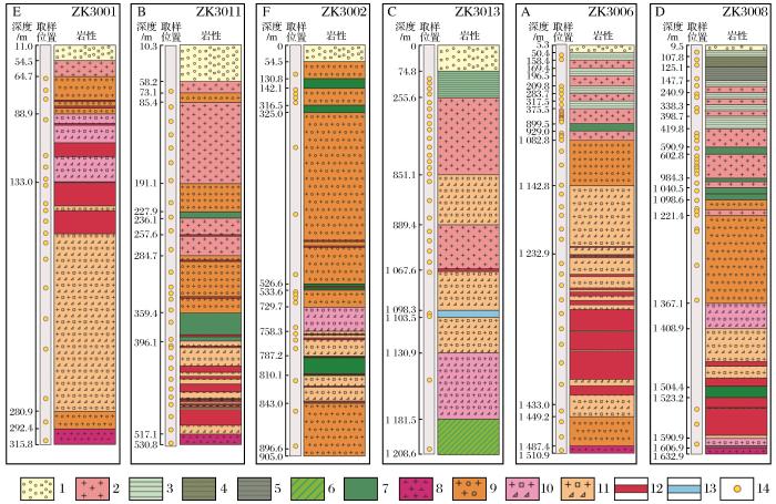 具体从钻孔中揭露的各个地质体情况来分析,在Al-OH吸收峰位上,辉绿玢岩和变辉长岩地层值较高,矿体与蚀变花岗岩之间区别大不;在伊利石结晶度IC值上,矿体最大,明显不同于辉绿玢岩、变辉长岩地层、新鲜和蚀变的花岗岩,可作为显著的找矿标志(图9和图10)。在蚀变矿物组合和分带特征上,矿体产状较陡的浅部钻孔中蚀变矿物显示主要为伊利石、白云母及少量黏土矿物的组合(ZK3001和ZK3002钻孔),深部断裂产状由陡变缓部位蚀变矿物也显示主要为伊利石和白云母组合,但是黏土矿物和碳酸盐矿物含量显著增高,并且由浅到深表现为白云母逐渐增加的趋势(图10)。深部发育热液蚀变,其蚀变矿物类型多样,可能是由于断裂产状由陡变缓部位热液流体充分聚集,并形成了矿体厚大的高品位矿段(Li et al.,2023b)。除此之外,控矿断裂由陡变缓部位具有形态较缓(倾角35°~43°)、断层泥发育、构造破碎带厚大和破碎程度强—剧烈(多为黄铁绢英岩化碎裂岩+黄铁绢英岩化花岗质碎裂岩+绢英岩化碎裂岩的组合形式)等特点,硫化物组合主要为稠密浸染状/脉状的黄铁矿、白铁矿、方铅矿、闪锌矿、黄铜矿和毒砂等;在控矿断裂陡倾部位,断裂形态明显较陡(倾角75°~85°),断层泥不发育,构造破碎带宽度较小(<20 m),破碎程度弱(主要为绢英岩化花岗岩+弱绢英岩化碎裂岩的岩性组合),硫化物也较少发育,主要为零星的黄铁矿(表1)。这些特征与胶东其他断裂带含矿和贫矿特征基本吻合(宋明春等,2018,2020),暗示着上述规律可作为胶东金矿床在断裂构造方面的找矿标志。本研究结果与前人所建立的阶梯式成矿模式相符(宋明春等,2012)。