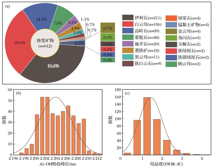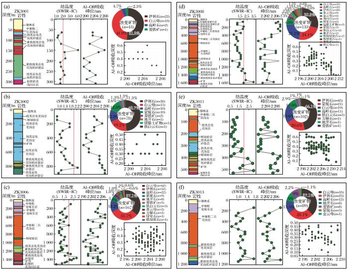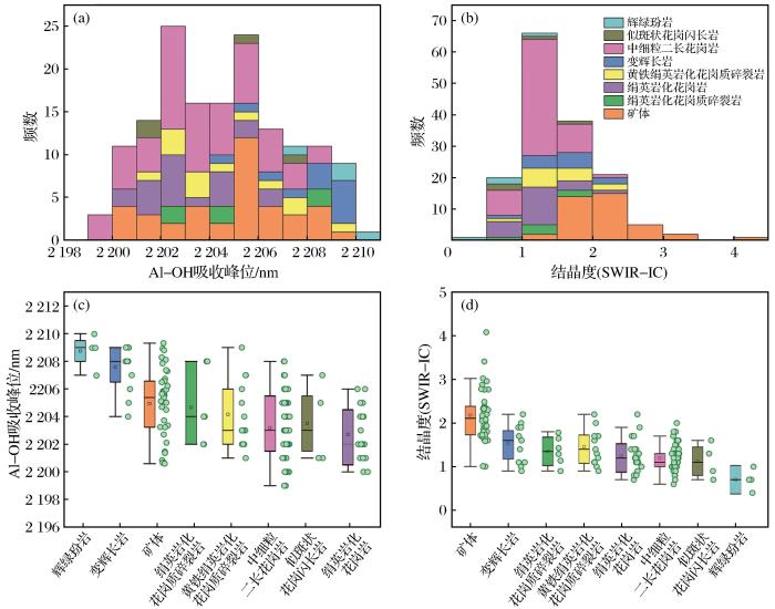 ... 金矿床与热液蚀变之间的关系,一直是矿产勘查的重要指示标志和关注的焦点(Groves et al.,1998).现有大量研究证实绢云母是脉型金矿床发育的主要蚀变矿物,其Al-OH吸收峰位和结晶度可作为重要的勘查标识,可以指示热液蚀变和矿化中心(Wang et al.,2017;Zhao et al.,2024). ...