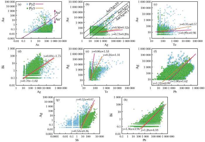 Au与As元素之间显示显著的正相关关系,且Ⅱ阶段黄铁矿Au含量位于金饱和曲线上方,说明其以纳米颗粒形式存在(Au0),暗示着初始成矿流体具有较高的金含量(图11)。Au与As元素之间的相关性还指示在黄铁矿沉淀过程中As与S元素发生了离子替换,由于离子半径的差异使得黄铁矿晶格发生变形,使Au元素得以进入黄铁矿晶格中(Reich et al.,2005;Li et al.,2023b)。Au与Ag元素也具有一定的正相关关系,且暗示着不见金到可见金之间存在一定的转化过程(Hastie et al.,2020;Li et al.,2023)。Au、Ag与Pb、Bi、Te、Sb等元素之间的相关性也指示三山岛断裂带金的多样富集过程。研究指出,As、Sb、Bi、Hg、Pb、Se、Te、Tl和Sn等为低熔点亲铜性元素(LMCE)(刘家军等,2021),可在低至300 ℃的温度下以熔体形式存在(Frost et al.,2002;Ciobanu et al.,2006),并优先从流体中分离出来。暗示着成矿流体演化过程中,LMCE熔体的存在高效地抽离了金(Tooth et al.,2011),这也是三山岛断裂带大量粗颗粒发育的重要原因之一(Li et al.,2023b)。在断裂产状由陡变缓的转折端热液充足,更有助于上述过程的发生(宋明春等,2012)。根据含金黄铁矿微量元素分析,本文提出离子替换、LMCE熔体的高效抽离作用、不可见金到可见金的转换过程以及断裂蚀变带的阶梯式变化等综合因素控制着三山岛断裂带金矿体的发育,这也可能是胶东蚀变岩型金矿床发育的关键控制因素。最新研究指出,胶东石英脉型金矿床可能经历了幕式流体脉冲过程,不过LMCE熔体同样发挥了关键作用(Cai et al.,2024)。