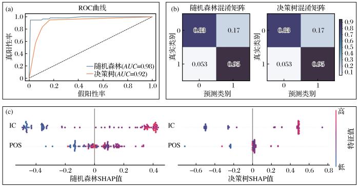 (a)ROC曲线和AUC值;(b)不同模型的混淆矩阵;(c)不同模型的特征SHAP值图注:ROC曲线是一种用于衡量二分类模型性能的图形化工具,其以真阳性率(True Positive Rate,又称敏感度)为纵轴,假阳性率(False Positive Rate)为横轴,将不同阈值下的分类结果可视化展现出来。在ROC曲线上,理想情况下,模型的曲线越接近左上角(0,1)点,表示模型的性能越好。AUC(Area Under the Curve)是ROC曲线下面积的数值,代表了分类模型的性能。AUC的取值范围在0~1之间,数值越接近1,代表模型的性能越优秀。AUC为0.5时,代表模型的分类能力等同于随机猜测,而当AUC为1时,表示模型完美预测了样本的类别。SHAP图中,从垂直顶部到底部的顺序表示特征的重要性,红色表示高特征值,蓝色表示低特征值,水平轴表示特征值对输出的影响