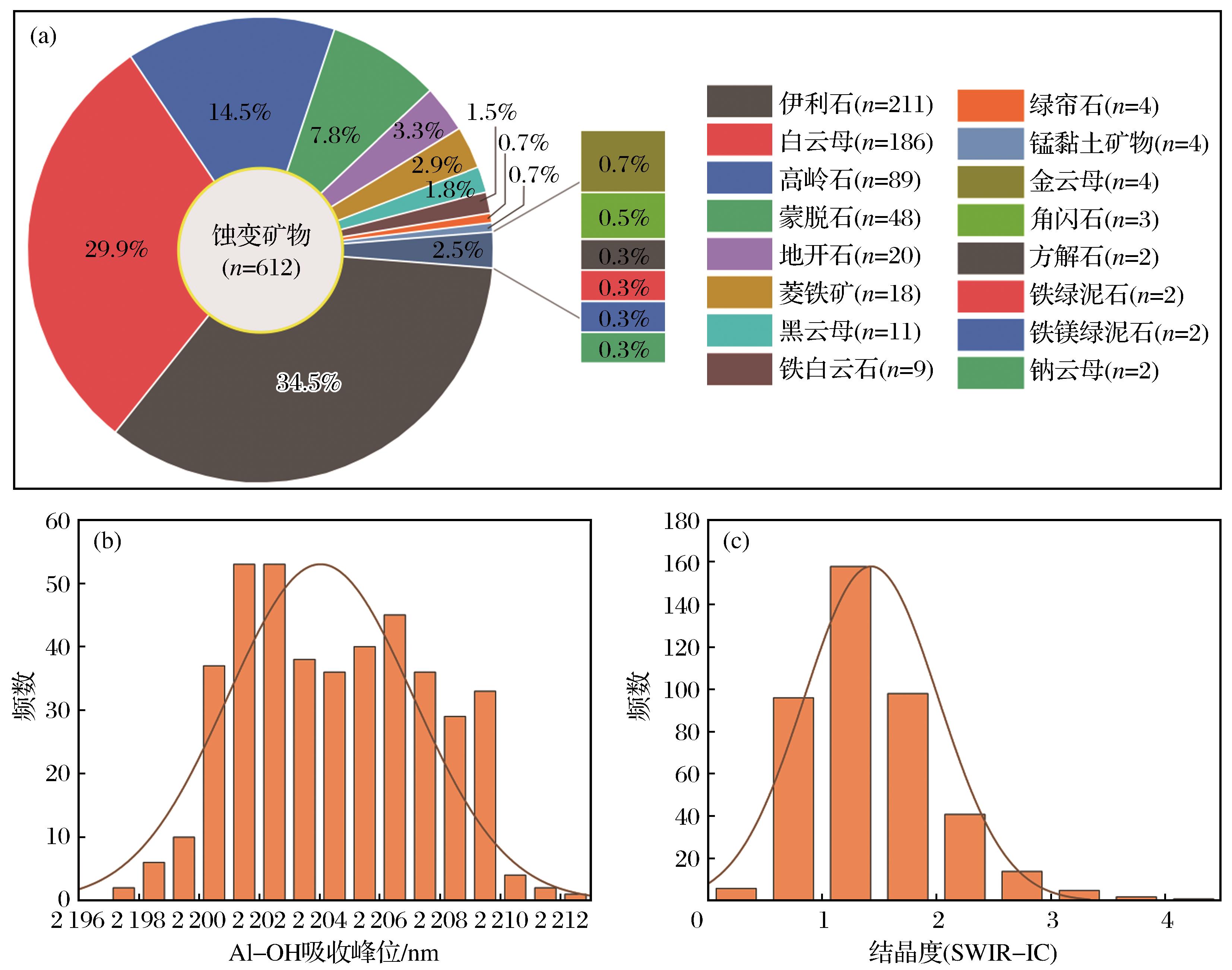 | Fig.7 Short wave infrared spectroscopy of altered minerals,distribution characteristics of Al-OH absorption peaks and crystallinity in Beibuhaiyu gold deposit |