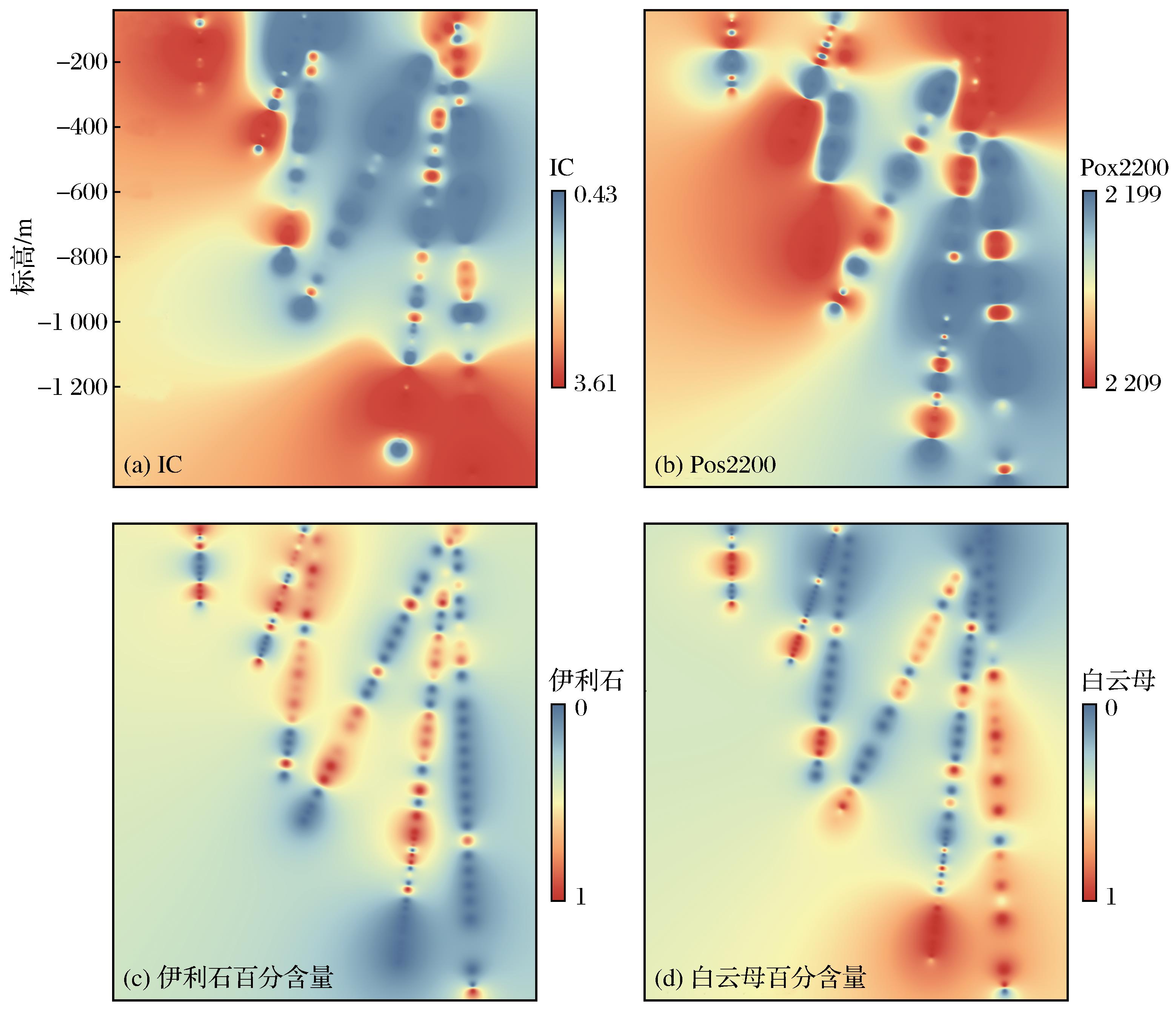 | 图14 北部海域金矿床30号勘探线地质剖面图(显示Pos2200、IC、伊利石和白云母百分含量等值线) |