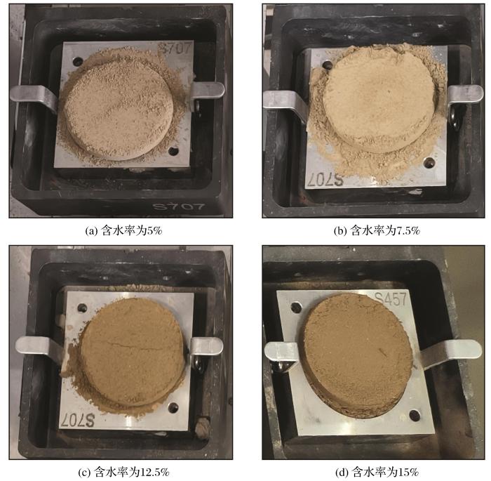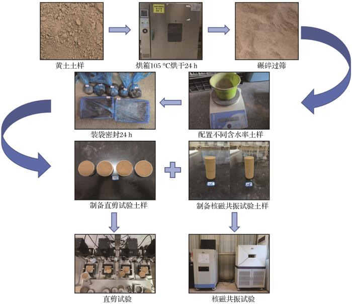 试验流程如图3所示,按照土工试验规范,将土样进行碾碎和烘干后,采用孔径为1.25 mm的孔筛对土样进行筛选。将土样配置成含水率为5%~30%的土样,含水率梯度为2.5%,共11个分组,将土样放置于密封袋中,静置24 h以上,确保土样含水率分布均匀后再进行直剪试验。直剪试验使用的仪器为四联直剪仪,设置垂直应力梯度为100 kPa,起始法向应力为100 kPa,各土样的垂直应力分别为100,200,300,400 kPa。参照原状土干密度为1.55~1.62 g/cm3,采用静压法制备成干密度为1.55 g/cm3、直径为39.1mm、高度为80 mm的圆柱状土样,用于核磁共振试验。核磁共振设备采用苏州纽迈科技有限公司生产的MesoMR23-060H型核磁共振分析仪,对不同含水率土样进行孔隙率和T2谱测试。
