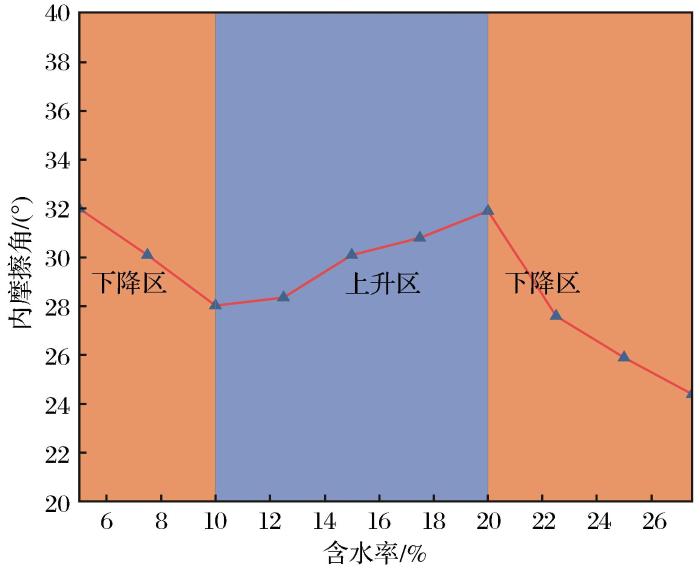 土样的内摩擦角随含水率的变化曲线如图 7所示,总体来说,随着含水率的增大,内摩擦角呈下降趋势,但变化幅度较小。不同的含水率范围内,土样的内摩擦角变化幅度存在差异。当含水率低于7.5%时,土样的内摩擦角随含水率的增大而略微增大,变化幅度较小;当含水率由7.5%增大至10%时,内摩擦角呈缓慢减小;当含水率为10%~20%时,内摩擦角随含水率的增大而缓慢增大;当土样含水率超过20%时,随着含水率的增大,内摩擦角出现小幅减小。