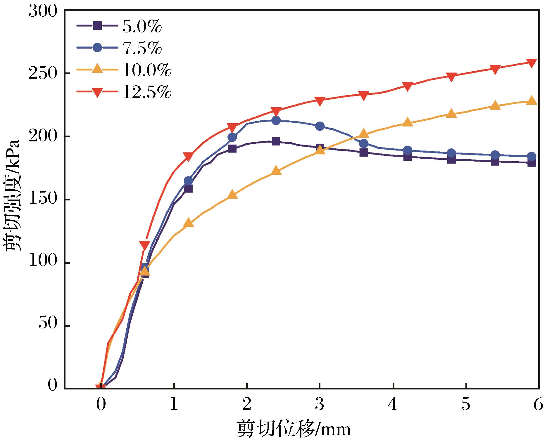 | 图11 400 kPa垂直应力下土样的剪切强度与剪切位移的关系曲线 |