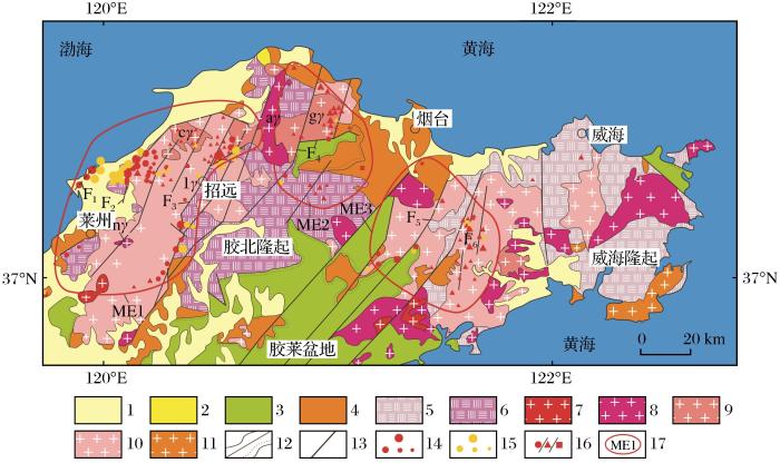 ME1-胶西北成矿小区;ME2-栖蓬福成矿小区;ME3-牟乳成矿小区;1.第四系;2.新近系和古近系;3.白垩系;4.古—新元古界;5.含榴辉岩的新元古代花岗质片麻岩;6.太古宙花岗—绿岩带;7.白垩纪崂山型花岗岩;8.白垩纪伟德山型花岗岩;9.白垩纪郭家岭型花岗闪长岩;10.侏罗纪花岗岩;11.三叠纪花岗岩;12.整合/不整合地质界限;13.断层;14.以往探明的浅部金矿床位置(直径由大到小分别表示资源/储量大于等于100 t的超大型金矿床、资源/储量在 20~100 t的大型金矿床、资源/储量5~20 t的中型金矿床和资源/储量小于5 t的小型金矿床);15.新探明的深部金矿床位置(直径大小的意义同图例14);16.蚀变岩型/石英脉型/其他类型金矿;17.金成矿小区范围及编号
