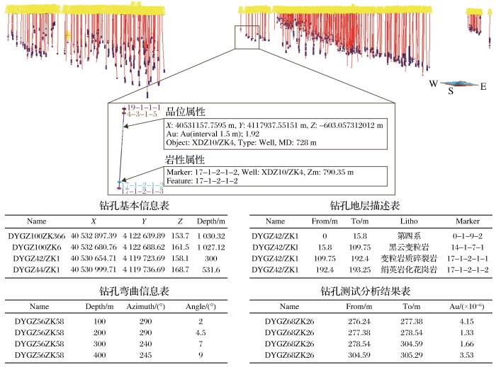 使用钻孔数据对搭建的三维框架模型进行属性填充。将钻孔数据整理为4个表格,分别为钻孔基本信息表、钻孔弯曲信息表、钻孔地层描述表和钻孔测试分析结果表。使用和处理的钻孔数据包括机械岩心钻探344 998.23 m/475孔,测斜数据5 510条,岩性数据5 796条,金基本分析数据38 264条(图3)。