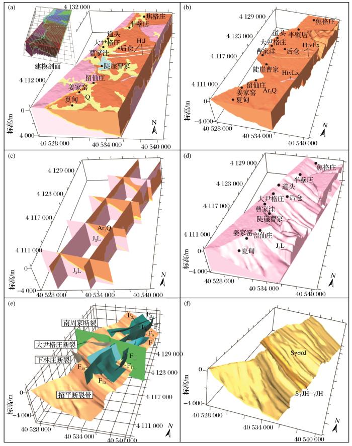 采用地质剖面法构建三维地质模型,针对被系统钻探工程控制的已知矿区和缺乏钻探工程控制的地质工作程度较低区段,采用不同的地质剖面及数据处理方式。大尹格庄—曹家洼和夏甸—姜家窑2个金矿田所在地段地质勘查程度高,已施工大量探矿工程,形成系统的勘查网度,作为已知矿区,主要依据勘探线地质剖面建立精细的三维地质模型。这2个金矿田外围的地质工作程度较低,除地表填图数据之外,仅施工少量钻探工程,主要依据物探数据进行地质剖面解译,建立了推断解释的三维地质模型。