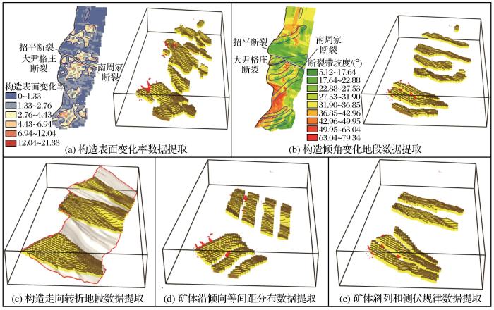 | 构造走向转折 | 构造表面变化率 | 构造产状变化 | 倾向等间距 | 侧伏和斜列规律 | ||