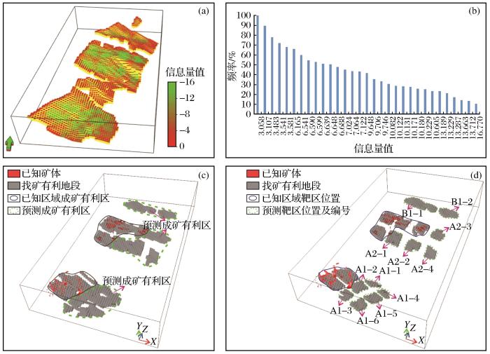 (a)预测模型;(b)信息量统计直方图;(c)找矿有利区;(d)找矿靶区