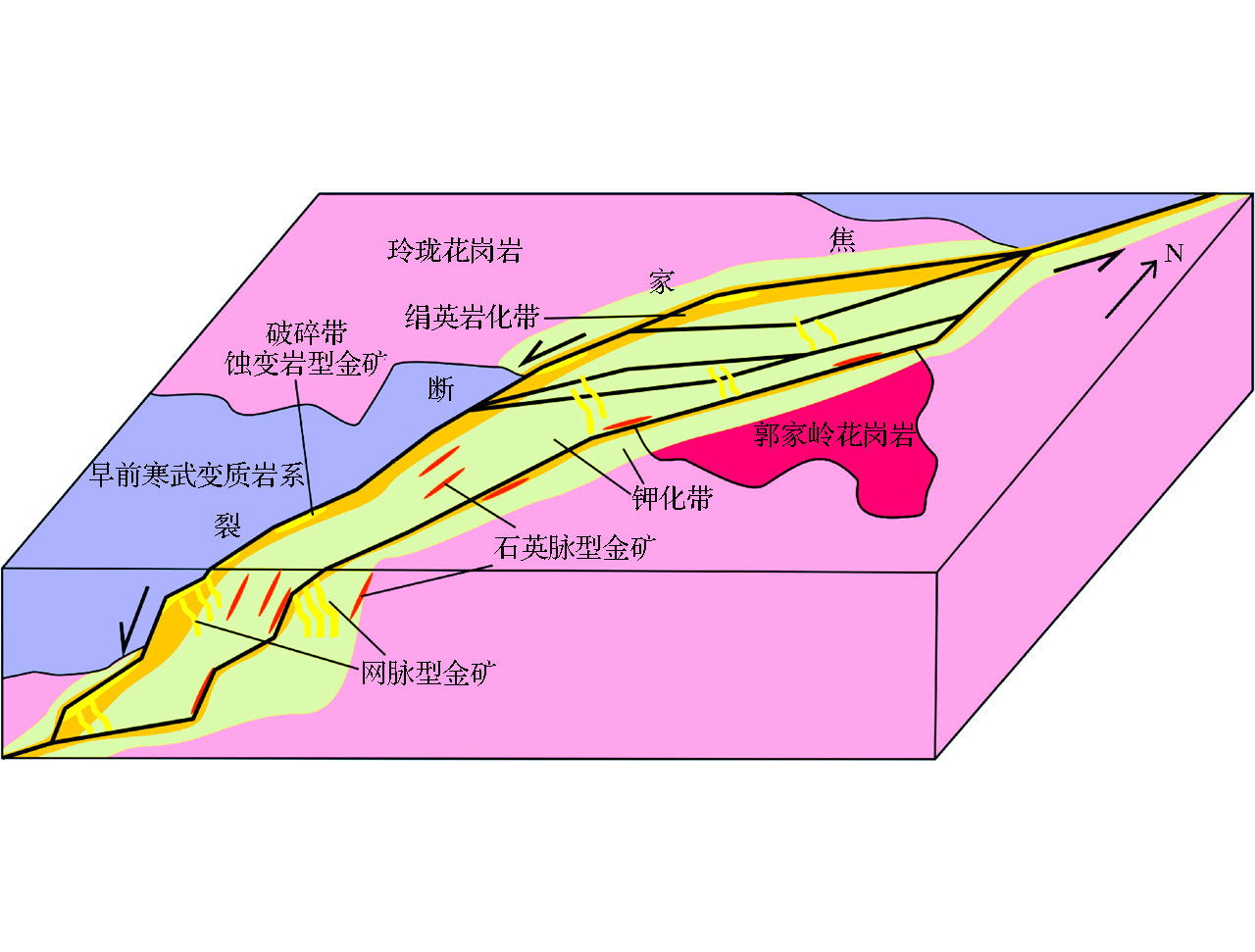 胶东地区已累计探明金资源储量超过4 500t,成为世界级重要的金矿集区之一。该地区发育蚀变岩型、石英脉型和层间破碎带型金矿,受区域主干断裂、次级断裂及盆地边滑动断裂的控制,其中蚀变岩型金矿是区内最重要的金矿类型。胶东西北部已发现的超大型金矿均受胶西北三山岛、焦家和招平3条主干断裂的控制,3条主干断裂控制的金矿资源量已超过3 300t。这3条主干断裂阶段活动明显:早阶段发生韧性剪切变形作用,形成韧性剪切带,由糜棱岩和糜棱岩化岩石组成;中阶段发生脆性变形作用,形成碎裂岩(化)带;晚阶段为挤压变形,形成断层泥。金矿成矿与中期脆性变形密切相关,金矿化赋存于主干断裂带中碎裂(角砾)岩带发育部位。研究表明,3条主干断裂深部仍具有巨大的找矿潜力。